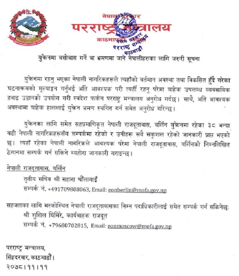 बुधबार परराष्ट्र मन्त्रालयले एक सूचना जारी गर्दै दुई देशबीचको द्वन्द्व युद्धमा परिणत हुन सक्ने भन्दै युक्रेनमा रहेका सबै नेपाली नागरिकलाई घटनाक्रमको मूल्याकंन गरी स्वदेश फर्कन अनुरोध गरेको हो ।