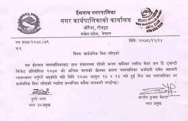 अन्तर पालिकास्तरीय मेयर कप टी–ट्वान्टी क्रिकेट प्रतियोगिताको अन्तिम चरणका खेल हेर्नका लागि नगरपालिकाले आज र भोलि गरेर दुई दिन सार्वजनिक विदा दिएको हो ।