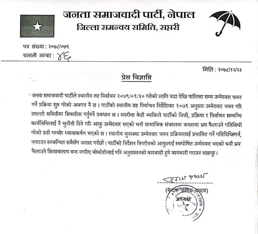 पार्टीका जिल्ला अध्यक्ष केदार यादवले बुधबार बिज्ञप्ती जारी गर्दै निर्देशन विपरीत आफूलाई स्वघोषित उम्मेदवार भएको भनी भ्रम फैलाउने क्रियाकलाप बन्द नगरिए जोकोहीलाई पनि अनुशासनको कारबाहीहुने चेतावनी दिएका छन् ।
