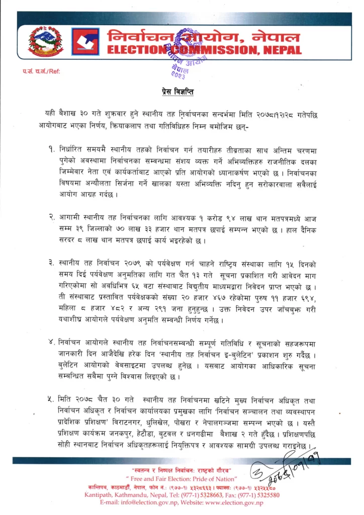 बैशाख १ः निर्वाचन आयोगले ३९ जिल्लाका लागि मतपत्र छपाइको काम सकिएको बताएको छ ।
