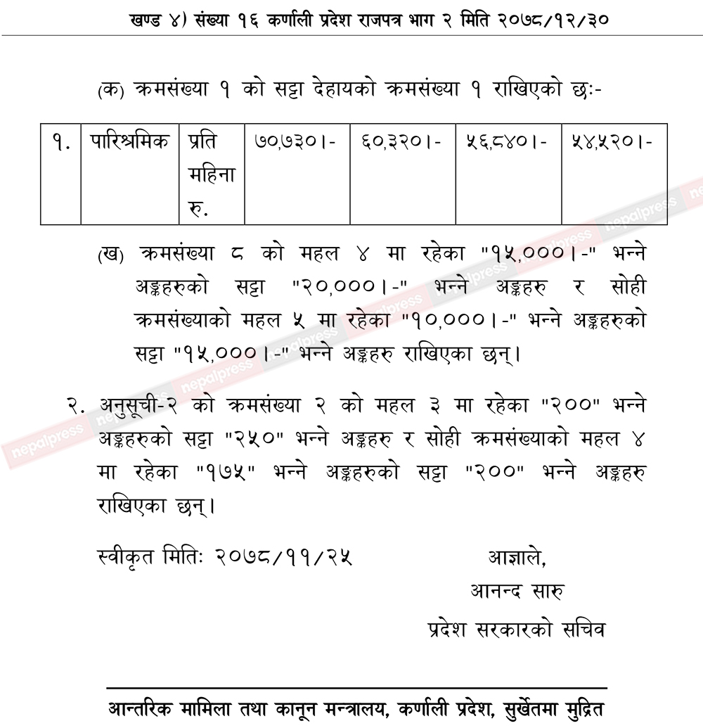 सरकारले हेरफेर गरेको अनुसूचीअनुसार मुख्यमन्त्रीको तलब सुविधा ७० हजार ७३० पुगेको छ । यसअघि मुख्यमन्त्रीले मासिक ६० हजार ९७० बुझ्थे । यस्तै मन्त्रीहरुले ५२ हजार पाइरहेकोमा अब ६० हजार ३२० रूपैंया पाउने भएका छन् । कर्णालीमा राज्यमन्त्री र सहायक मन्त्री भने छैनन् । यद्यपि सरकारले यी दुवै मन्त्रीको सेवा सुविधामा समेत वृद्धि गरेको छ।