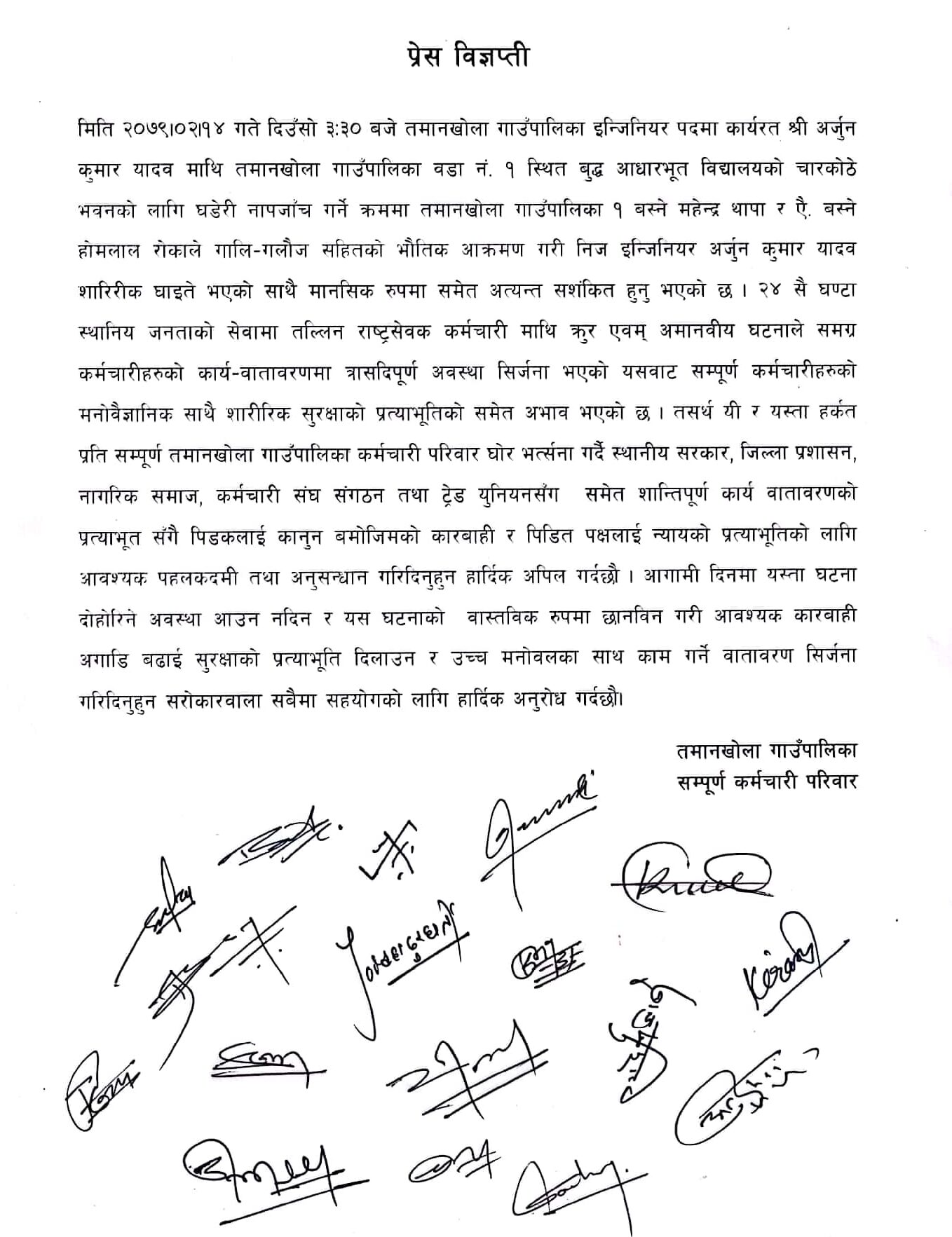२४ सै घण्टा स्थानीय जनताको सेवामा तल्लिन रहने राष्ट्रसेवक कर्मचारि माथी क्रुर एवम् अमानवीय ब्यवहार गरेको भन्दै अर्जुन माथी भौतिक आक्रमण गर्नेहरुलाई तत्काल कानुन बमोजिम कार्वाही गर्न माग गरेका छन् ।