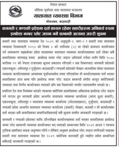 यातायात व्यवस्था विभागले एक सूचना जारी गर्दै यी दुई प्रदेशमा दर्ता कायम रहेका मोटरसाइकलसहित सवारीसाधनमा १ साउनसम्म इम्बोस्ड नम्बर नगरिए कारबाही हुने चेतावनी दिएको छ ।