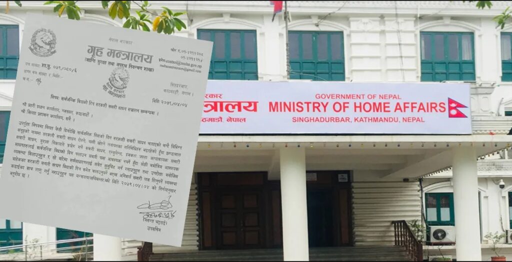साउन ५ः गृह मन्त्रालयले सार्वजनिक विदाको दिनमा चल्ने सरकारी सवारी साधनको चाबी नखोस्न निर्देशन दिएको छ ।