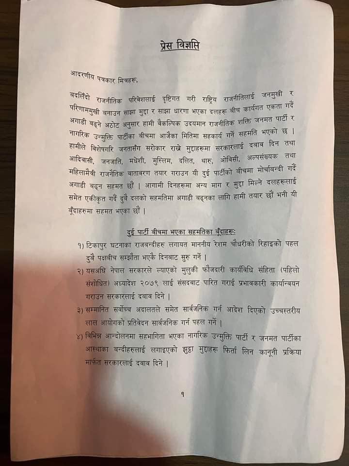 जनमतका अध्यक्ष सिके राउत र नागरिक उन्मुक्ति पार्टीकी अध्यक्ष रञ्जिता श्रेष्ठले आइतबार १२ बुँदे सम्झौता पत्रमा हस्ताक्षर गरेका छन् ।