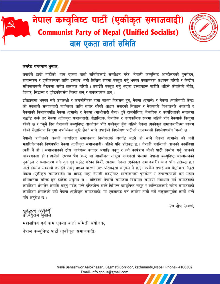 पत्रमा भनिएको छ, ‘यतिबेला नेपाली समाजमा विद्ययमान समस्या समाधान गर्न समाजवादी कार्यदिशा अंगालेर अगाडि बढ्नुपर्दछ भन्ने दृष्टिकोण राख्ने विभिन्न कम्युनिस्ट समूह र व्यक्तिहरुलाई समेत समाजवादी कार्यदिशा अंगालेको यही नेकपा एकीकृत समाजवादी मा आवद्ध गर्ने कार्यमा हामी सबै सक्रियतापूर्वक लागौं भन्ने पनि अनुरोध छ ।’