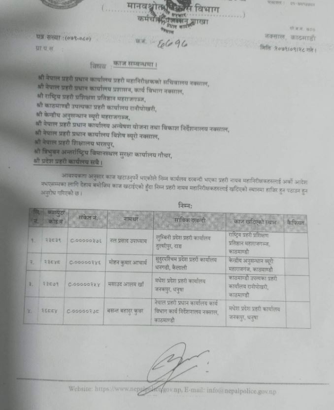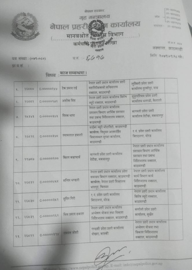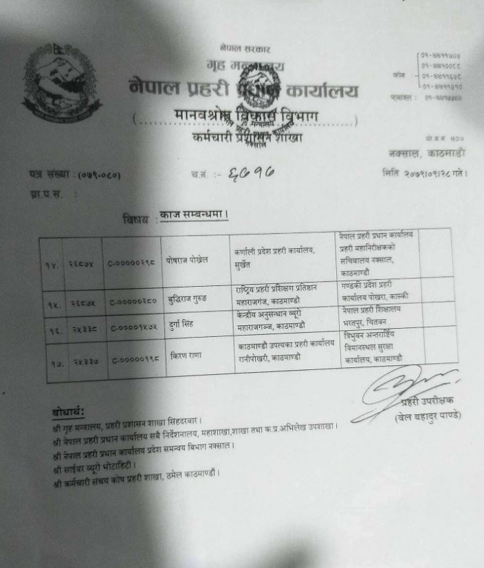 यसैगरी सुदूरपश्चिम प्रदेश प्रहरी कार्यालयका माेहनप्रसाद आचार्यलले केन्द्रीय अनुसन्धान ब्यूराे, महाराजगन्ज, काठमाडौँकाे जिम्मेवारी पाएका छन् ।