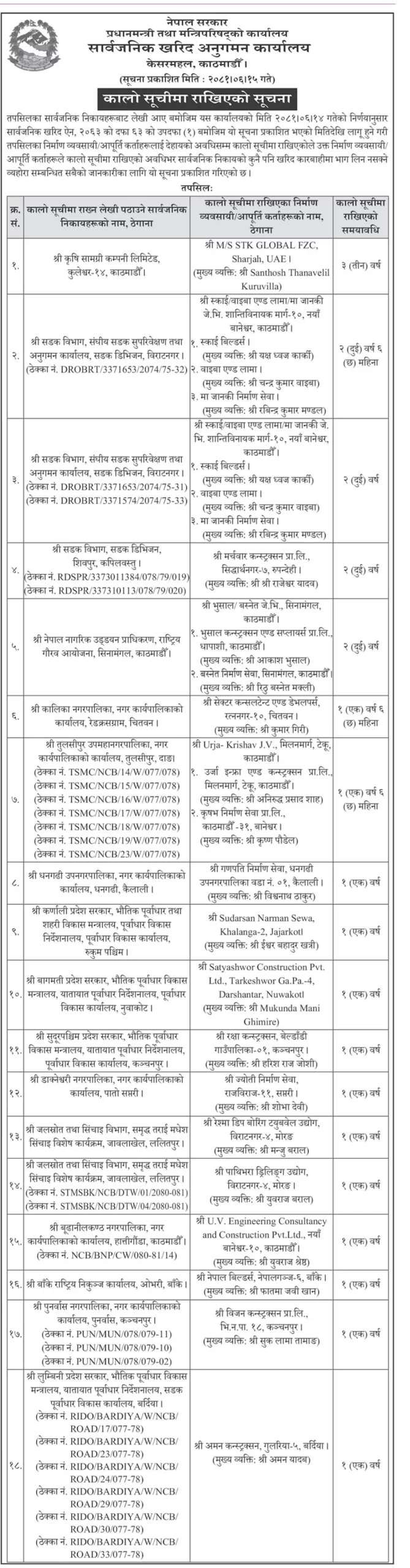 सार्वजनिक खरिद ऐन, २०६३ को दफा ६३ को उपदफा (१) बमोजिम सूचना प्रकाशित भएको मितिदेखि लागू हुने गरी विभिन्न २१ निर्माण व्यवसायी तथा आपूर्ति कर्तासँग कुनै कारोबार नगर्न सूचनामार्फत आग्रह गरिएको हो ।