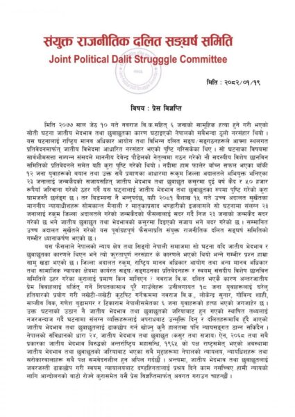 काठमाडौं । २०७७ जेठ १० मा नवराज विकसहित ६ जनाको सामूहिक हत्याको सोती घटनामा उच्च अदालत सुर्खेतको फैसला पूर्वाग्रहपूर्ण भन्दै संयुक्त राजनीतिक दलित संघर्ष समितिले आपत्ति जनाएको छ ।