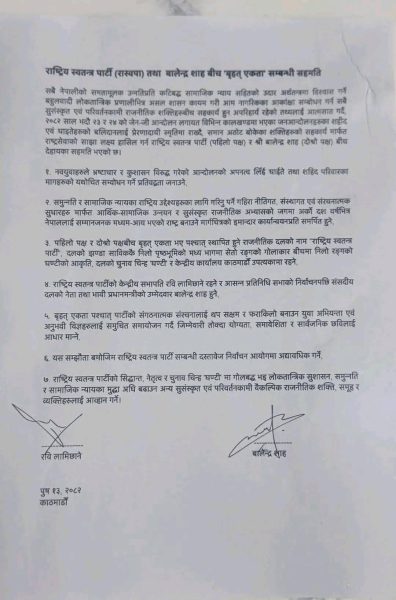 सहमतिपछि नयाँ बन्ने दल, चुनाव चिह्न र पार्टी कार्यालयको नाम पनि राष्ट्रिय स्वतन्त्र पार्टीकै रहने र संगठनमा युवालाई व्यापक सहभागी गराउने विषय पनि समावेश छ।