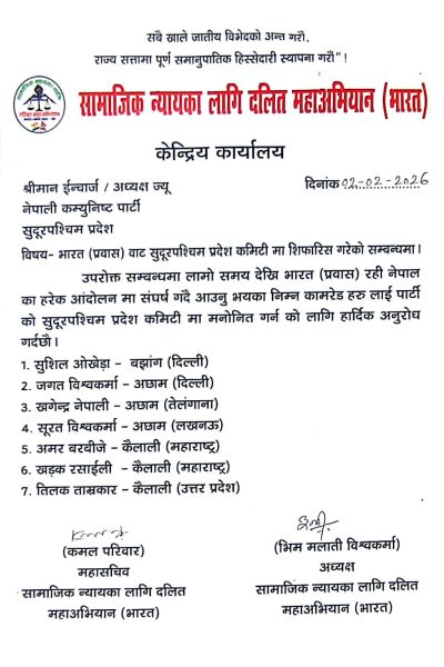 अध्यक्ष भिम मलाती विश्वकर्मा र महासचिव कमल परिवारको हस्ताक्षरमा जारी गरिएको यी सिफारिस र एजेन्डाहरूले दलित आन्दोलनलाई नयाँ उचाइ दिने र नेपाली कम्युनिस्ट पार्टीलाई प्रवासमा अझ सुदृढ बनाउने विश्वास लिइएको छ। “सबै खाले जातीय विभेदको अन्त गरौँ, राज्य सत्तामा पूर्ण समानुपातिक हिस्सेदारी स्थापना गरौँ” भन्ने मूल नाराका साथ अभियान अगाडि बढेको छ।